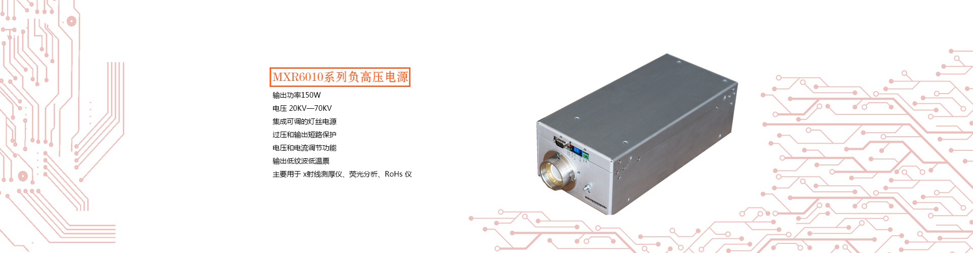 MXRN 系列負高壓電源是 X 光機專用高壓電源,射線管陽極接地易于散熱。它集成了懸浮可調的燈絲電源。電源輸出穩定低溫漂的高壓,燈絲電源及管流閉環控制,主要用于熒光分析、RoHs 儀、 測厚儀等。